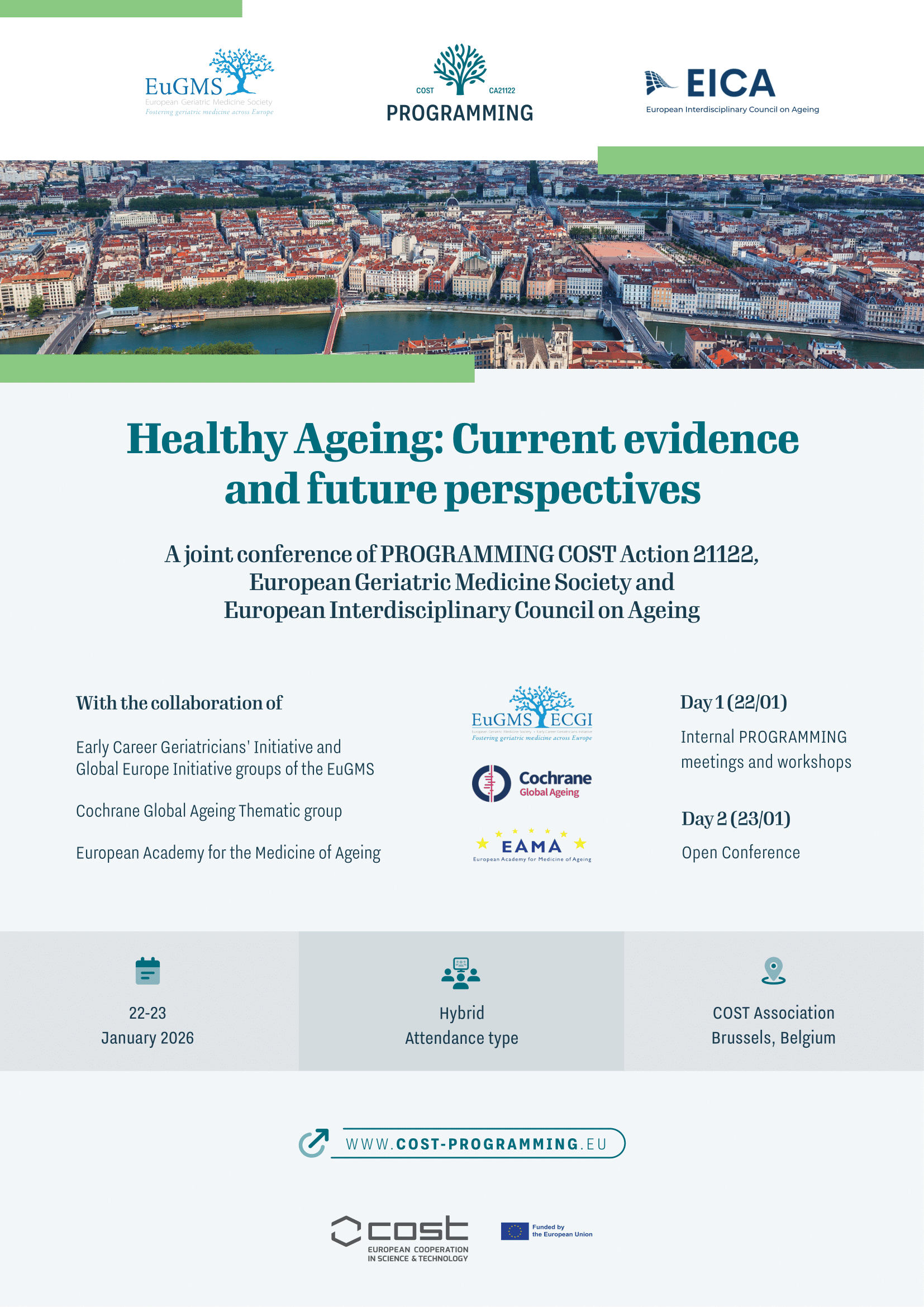 It is with great pleasure that PROGRAMMING COST Action 21122, the European Geriatric Medicine Society and the European Interdisciplinary Council on Ageing (EICA) welcome you to the joint conference “Healthy Ageing: Current evidence and future perspectives”, which will take place in Brussels, Belgium on the 23rd of January 2026 at the COST ASSOCIATION headquarters, Avenue du Boulevard – Bolwerklaan 21, 1210 Brussels, Belgium. The conference will be preceded by a day of internal meetings and workshops on 22 January, serving specific aims of the PROGRAMMING COST Action.